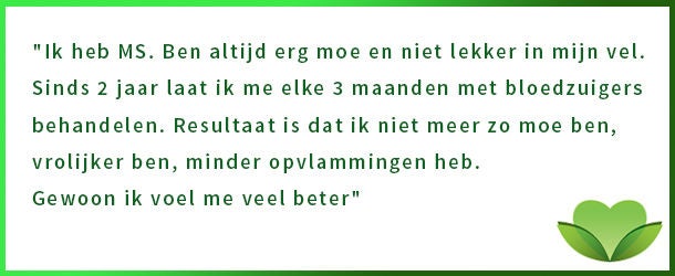 Bloedzuigers kunnen een chronische ziekte niet genezen maar wel verlichten. Door de behandelingen neemt de pijn sterk af, verminderen veel klachten en neemt de energie toe. Ze zorgen ervoor dat het immuunsysteem weer beter gaat functioneren. Hierdoor voelt u zich beter en kunt u weer meer doen en ondernemen. Bij chronische (auto-immuunziekten) is het belangrijk dat de lymfe, lever en nieren goed gaan reinigen. Tijdens de bloedzuiger behandelingen bij chronische ziekten worden eerst de lymfekanalen opengezet. Dat is een keer de onderrug, een keer de lever en nieren. Verder worden de bloedzuigers op of rond de aangedane plekken gezet.